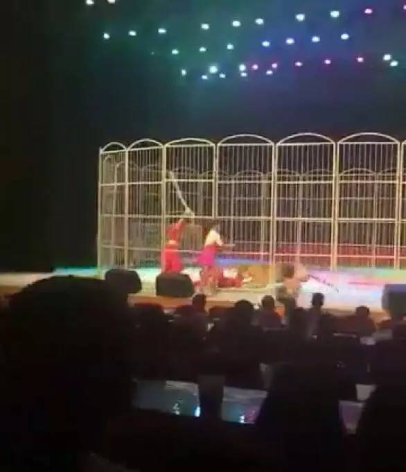 @Q萁妈咪:营口市辽河大剧院的马戏表演,当晚上演的一幕,老虎咬人了。拒绝马戏表演从我做起,真心希望国家开始倡导健康教育方式,彻底打击这种有违人道的马戏表演,让动物和人类都不再受伤害。