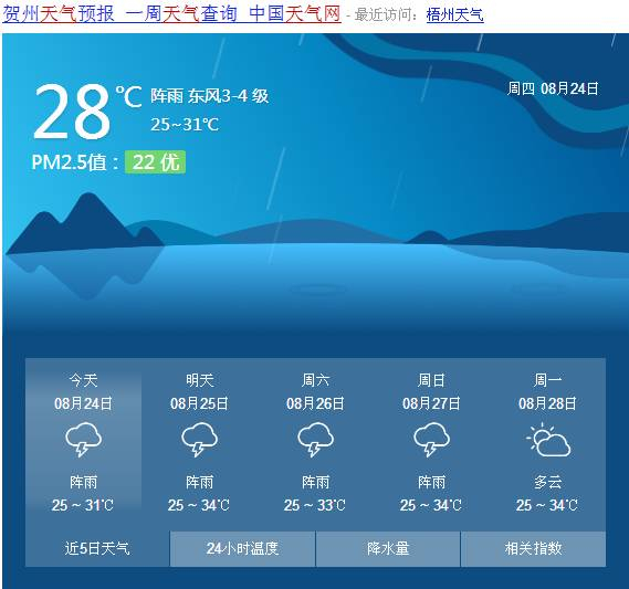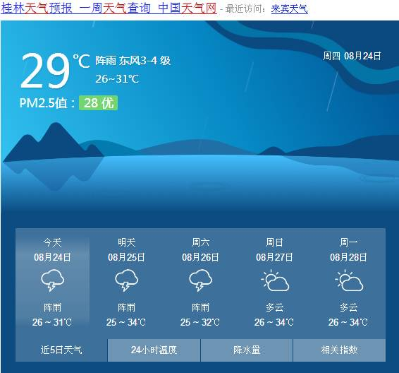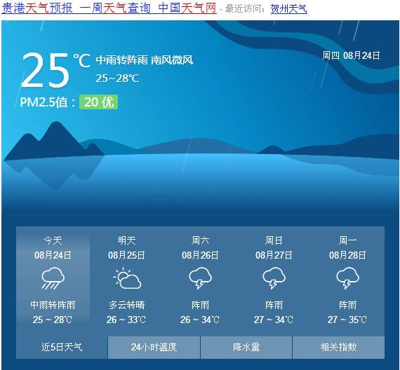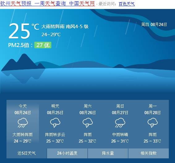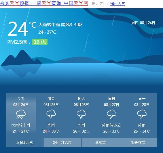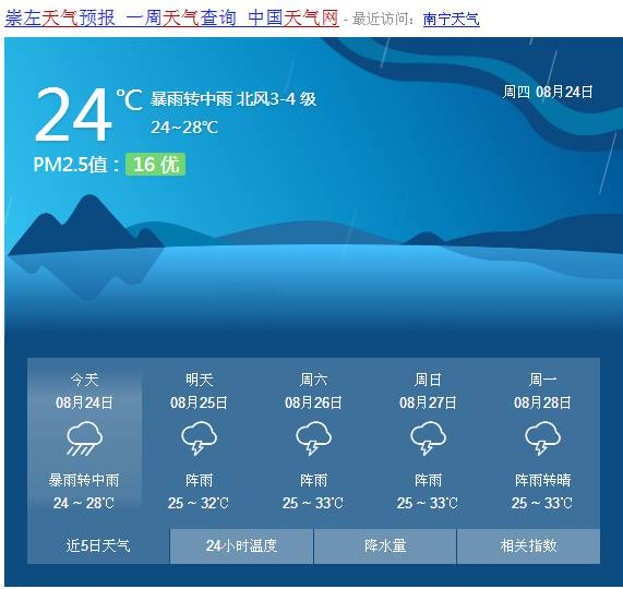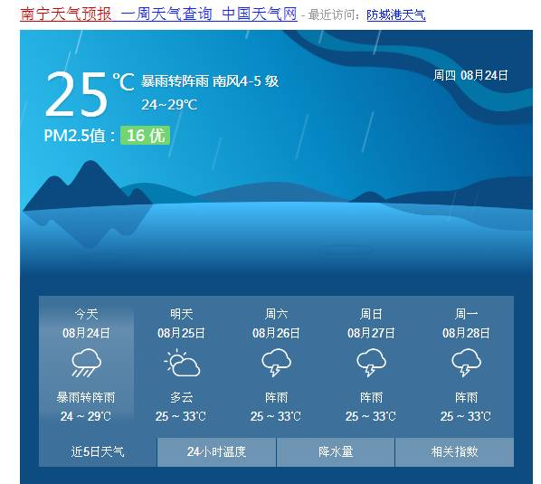 据@广西气象:【广西中南部风雨大 局部会有特大暴雨】今天(24日)白天到晚上,北海、钦州、防城港、南宁、贵港、来宾、河池、百色、崇左、玉林等市以及柳州市西部的部分地区有暴雨,局部大暴雨到特大暴雨,我区其它地区有小到中雨,局部暴雨。桂南的部分地区和沿海有5-6级大风,阵风7-8级。南宁市:今天白天到晚上,暴雨转阵雨,旋转风4-5级转3-4级,最高气温29℃,最低气温24℃。