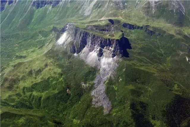 震后航拍图。由于震后山上碎石较多,导致九寨沟的几个海子原来碧蓝碧绿的水变成了黄色。