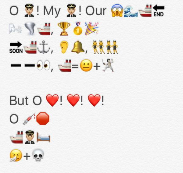 你能猜出这三首被翻译成emoji表情的是什么诗吗 澎湃新闻 2017.08.2414:01 关注 近日,文学杂志《巴黎评论》在网站上公布了三首诗歌。与众不同的是,这三首诗歌是被“翻译”成emoji表情的西方诗作名篇。来看看这三首“诗歌”究竟长什么样子吧。其实这三首诗都是名家名诗,难度并没有那么高。1. 2. 3.