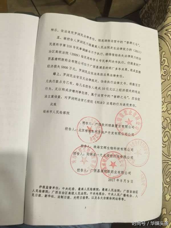 调查发现,该举报信为4张A4纸大小,举报信最后一页上密密麻麻盖了5个公章。这些举报单位分别是:广西钦州琼森置业有限公司、北京信德永利房地产开发有限公司公司、广西荔浦明胶药业有限公司、珠海宝辉生物科技有限公司、阳朔县一尺水实业投资开发有限公司。被举报人是广西桂林市中级法院执行法官罗润民。