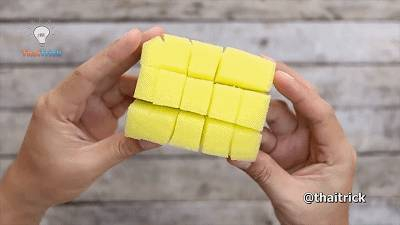 电风扇的网罩看着干净,其实缝隙之间很容易积攒灰尘。你只要用一块洗碗海绵,把它横着切几刀,再竖着切几刀,注意不要切断哦。