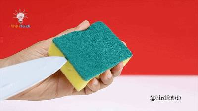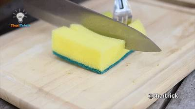 玻璃窗户、百叶窗一层一层擦起来很麻烦,同样可以利用海绵来帮忙!用小刀在海绵的侧端开个口子。