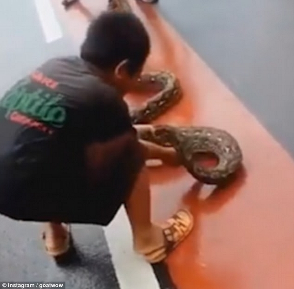 相关视频显示,一条约10英尺(约3米)长的巨蟒霸占在道路中央,使得路人非常惊恐,并且造成了严重的交通阻塞。之后,一个小男孩走进围观人群,在巨蟒面前上下挥动手臂、前后跳跃,试图引起它的注意,引诱它朝自己前行。考虑到需要尽快疏散交通,该男孩最终决定改变方法速战速决。只见他走到巨蟒背后,伸手迅速抓住其颈部,并将其带离车道。