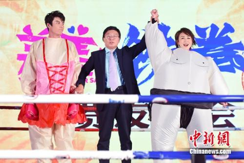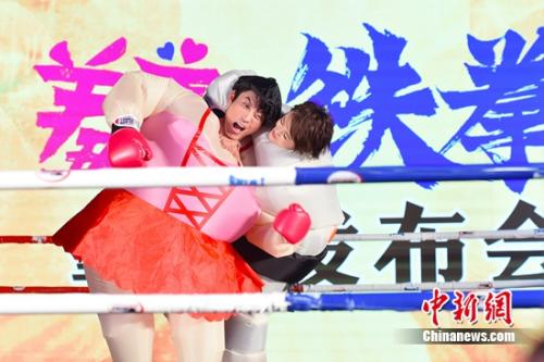 中新网北京8月24日电(记者 张曦)23日,电影《羞羞的铁拳》在北京举行发布会,演员艾伦和马丽身穿一身充满喜感的充气服亮相拳台,伴随着名嘴韩乔生的解说,两人的“互殴”引来台下一阵阵爆笑。