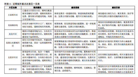 城市重点改善区,主要针对体现城市形象与面貌的重点空间,以及区位条件较佳、有较好发展基础,但环境负荷过重、配套设施不完善、综合环境较差、城市交通梗塞等对城市整体功能提升和产业发展造成不利影响的地区。昆明近期的城市重点改善区共有15个,分别为王家桥片区;龙泉路沿线;北仓片区;北部山水新城片区;五里多片区;凉亭片区;巫家坝片区;五甲塘片区;三个半岛片区;马街片区;草海片区;前卫片区;滇中空港门户片区;金马片区;斗南西片区。