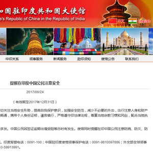 据中国驻印度大使馆网站消息,中国驻印度使馆提醒在印度中国公民注意安全。
