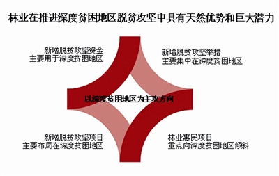 林业在推进深度贫困地区脱贫攻坚中具有天然优势和巨大潜力。各级林业部门以深度贫困地区为主攻方向,新增脱贫攻坚资金、项目、举措主要集中在深度贫困地区,林业惠民项目重点向深度贫困地区倾斜。对于深度贫困地区和贫困群众来说,脱贫潜力在山,致富希望在林。