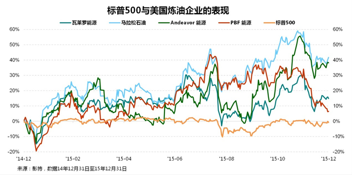 即便一开始对油价下跌的趋势有所犹豫,如果投资者能在15年初购买这几家纯炼油公司的股票,这些股票到年底的回报依然会比标普500高很多。这些股票在这一年的回报率分别是6%,15%,38%,42%,43%,而标普500则损失了0.8%。虽然每个股票的表现会受到不同因素的影响,但是趋势明显总体向上。