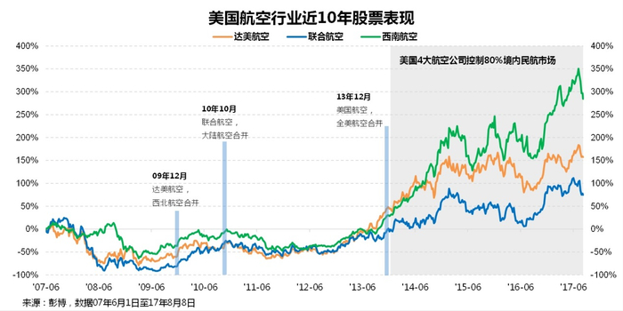 去过美国旅行的人十有八九都感受过美国民航三巨头的“优良”客户服务。飞机旧,座椅小,乘务员态度差都早已是普遍现象。但是很多人可能不知道,近三年是美国航空业放松管制后美国民航三巨头股价表现最佳的三年,不仅吸引了曾经发誓不再投资航空业的巴菲特的青睐,就连美联航强拖陶大卫医生下飞机的丑闻也没影响到美联航的股价。在世界的另一侧,服务较好的国泰航空和新加坡航空公司,近几年一直受到市场竞争激烈的压力,股价表现很差。背后的原因是,虽然这几家航空公司的业务相似,但面对的市场的整合度不一样。