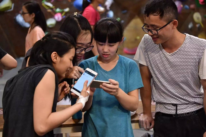 在岩馆里,彤彤(中)遇到几个一起攀岩的哥哥姐姐,他们也是从内地来的,在香港读书、工作。哥哥姐姐们都是彤彤的“粉丝”,纷纷要求加她微信。