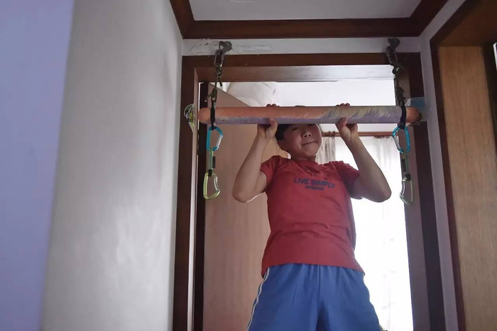 之后的每周一到周五放学后,张悦彤都坚持攀岩将近3个小时。在深圳的家里,张悦彤也利用安装在房门上的器械做引体向上。