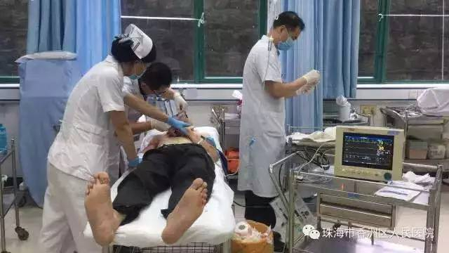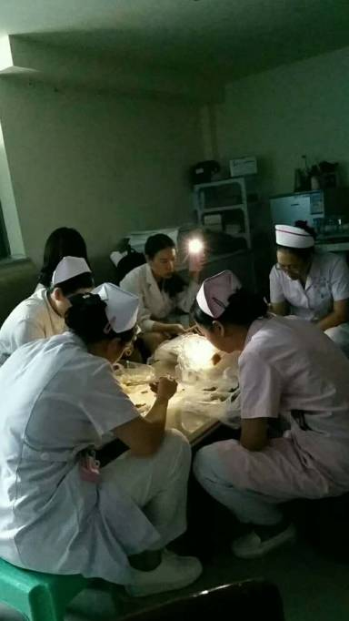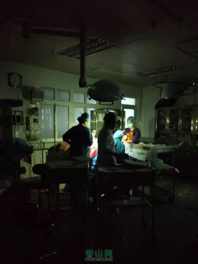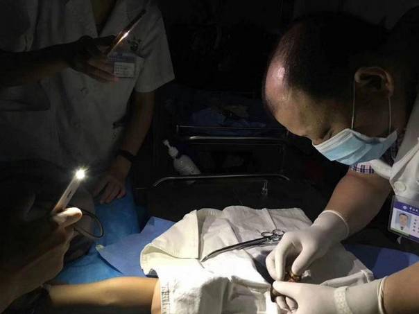 在珠海中大五院急诊科,一个医生在停电的情况下,借助同时们的手机照明,坚持给病人做清创缝合。