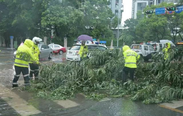 珠海香洲城区道路出现倒树拦路,香洲分局民警全员出动参与救援,警民合力清除白玫瑰花园附近道路倒树。