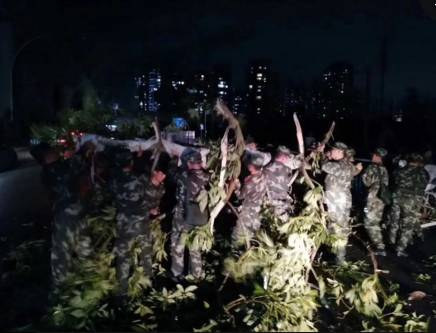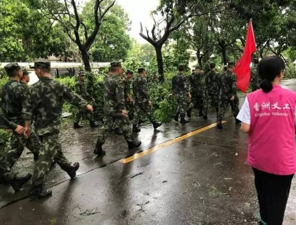 珠海春晖社区树木倒塌严重,辖区共建单位武警支队官兵、社区工作人员、党员志愿者一起合力攻艰解决道路通行问题,能移的树就移,能扶正的树木就扶正。在众人的努力下,原本被树木堵塞的道路迅速恢复通畅。紧接着,武警支队官兵马不停蹄又赶赴下一个“战场”。