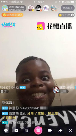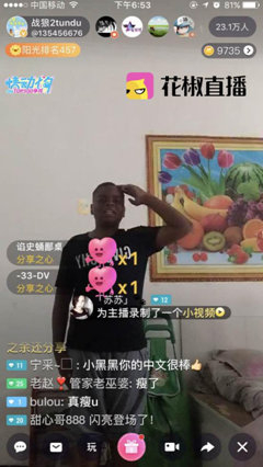 中新网8月24日电 《战狼2》火爆暑期,总票房已经突破50亿,屡创华语片票房纪录。影片中吴京干儿子“Tundu”的扮演者肯尼迪因自带喜感走红网络。8月23日,肯尼迪在花椒直播首秀大秀中文,无缝转换陕西方言和东北话,喜感十足。直播中他还表示同吴京的父子关系已“破裂”,“吐槽”吴京拒绝加他微信。