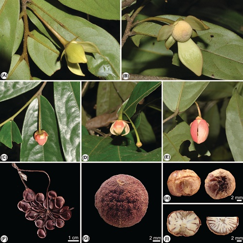 盈江暗罗花和果实形态A-E,F干果实,G单个干燥面果实,H 种子的侧面和顶部视图,I种子的横纵向视图