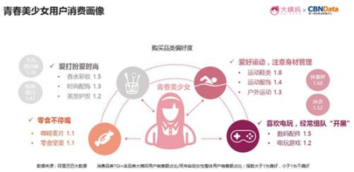 18-22岁的95后青春美少女群体主要关心经期护理、痛经问题。平日爱打扮爱时尚,同时也是爱电玩游戏;咖啡麦片零食不停口,靠运动来保持好身材,对运动鞋类、香水彩妆、体脂秤等偏好较高。