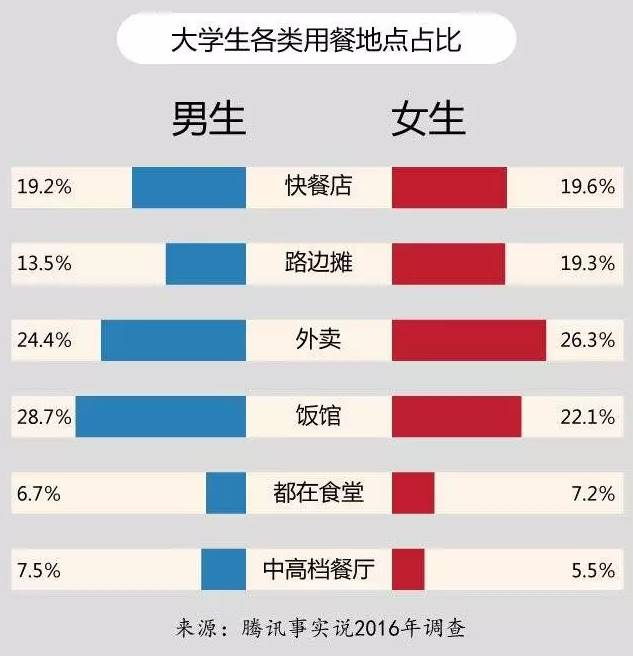 根据一份2016年的调查显示,叫外卖是女生的最爱,男生除了外卖,更爱去饭馆。