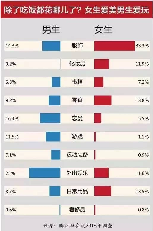 吃饭之外的花销中,女生买衣服花掉33%,男生的25%用来外出娱乐。恋爱也花不少钱,但男生恋爱消费占比是女生的两倍多呢。