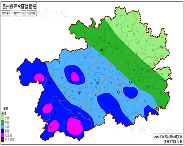 8月23日20时至24日14时,我省出现大暴雨1乡镇(晴隆县大厂镇140.9毫米),暴雨16乡镇,大雨4县城165乡镇,大雨以上降雨主要分布在贵阳市北部、安顺市中部、黔南州东南部、六盘水市南部、毕节市中部、黔西南州中西部。