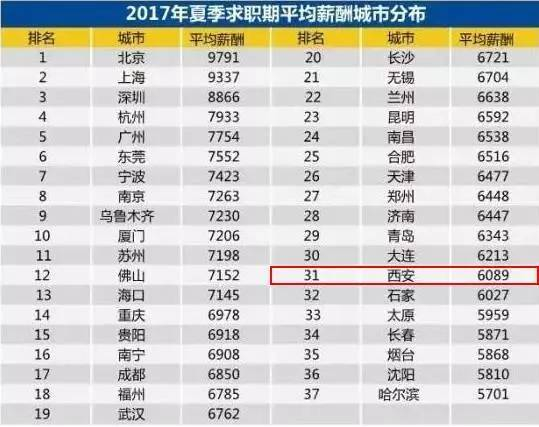 《2017年夏季求职期平均薪酬城市分布》数据显示
