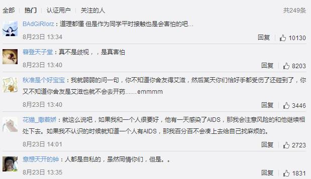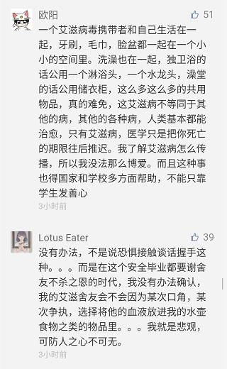 同时也有人担心,如果隐瞒艾滋病学生的身份,可能带来较大的隐患。正如有网友说的,隐瞒其艾滋身份,万一交往男女朋友,发生性关系怎么办?万一跟同学闹矛盾,打架把人抓伤咬伤了怎么办?比如说住一间宿舍,口腔溃疡牙龈出血了,剃须刀刮到血了,那都是有危险的。谁来保证同班级同宿舍人的安全,健康人的权利就不是权利了?