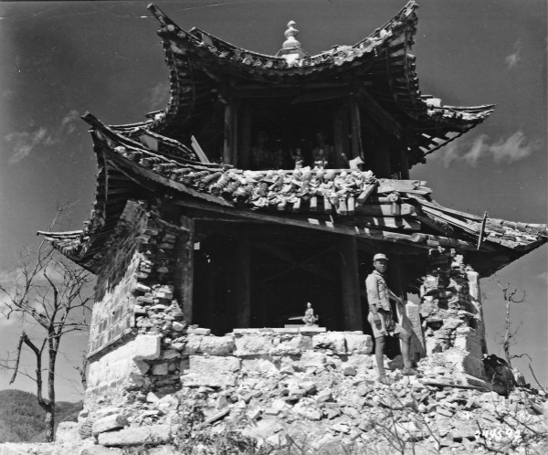 1944年11月8日,一位中国士兵站在龙陵附近伏龙寺的废墟上,该地曾为日军重要据点。
