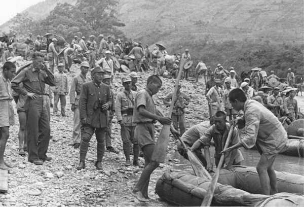 1944年6月,第11集团军开始渡过怒江反攻龙陵。总司令宋希濂(中持望远镜者)与美国顾问团长弗兰克·多恩(左叉腰者)在江边观察部队渡江情况。