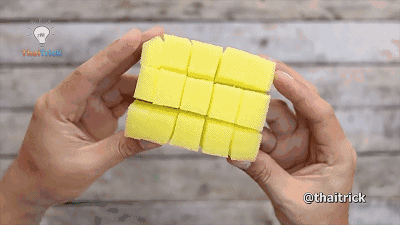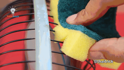电风扇的网罩看着干净,其实缝隙之间很容易积攒灰尘。你只要用一块洗碗海绵,把它横着切几刀,再竖着切几刀,注意不要切断哦。