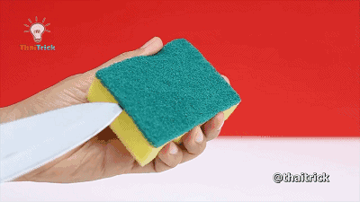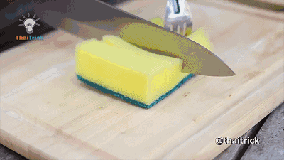 玻璃窗户、百叶窗一层一层擦起来很麻烦,同样可以利用海绵来帮忙!用小刀在海绵的侧端开个口子。