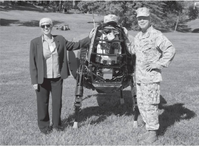▲资料图片:2014年,DARPA负责人阿拉蒂·普拉巴卡尔、海军陆战队司令詹姆斯·阿莫斯上将与DARPA设计用于崎岖地形运送重型装备的LS3陆地机器人。(图片来源:美国海军陆战队,马洛里·范德尚摄)