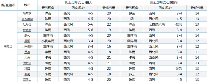 25日白天最高气温:大兴安岭、伊春(15-17)℃,鸡西、牡丹江(21-23)℃,其它地区(19-21)℃。