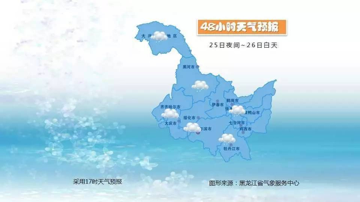 25日夜间到26日白天:齐齐哈尔南部、绥化南部、大庆、哈尔滨西部多云,其它地区多云有阵雨。