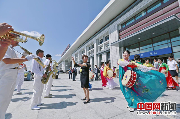 在延吉西站前载歌载舞的朝鲜族妇女。丁波/摄