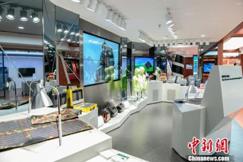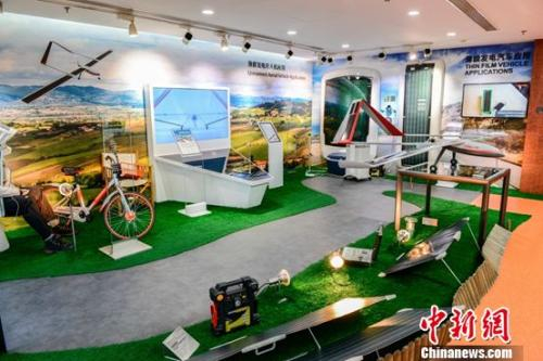 汉能展览馆展示的薄膜发电汽车车顶、无人机应用、共享单车应用等产品。中新网记者 富宇 摄