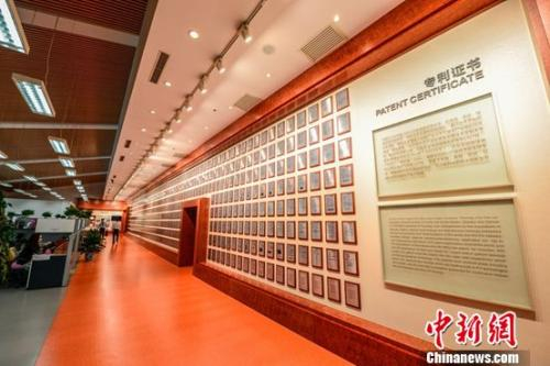 汉能北京总部办公室内的专利证书墙。中新网记者 富宇 摄