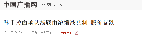 始料未及的是,一场“浓缩骨汤粉勾兑”的危机让味千(中国)的扩张计划不得不搁浅。2011年7月份,自称用猪骨熬制的味千拉面汤底被曝光是勾兑而成,在行业内引起轩然大波,味千(中国)当年的净利润同比直降56%。