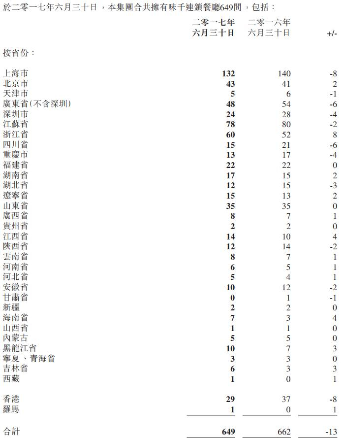 而在2016年和2017年上半年,味千(中国)的门店数量还在进一步减少。截至今年6月30日,共有门店数量649家,比上年同期减少13家。
