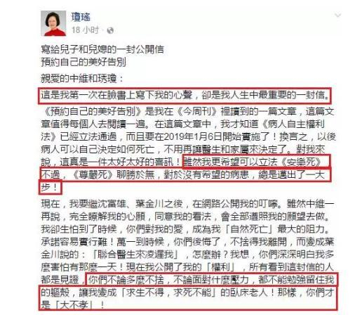 “我再也没有想到,当你们父亲躺在医院,最后为了我想写一部呼吁《病人权利自主法》和《善终权》的书,让我们两家分裂到这个地步!”