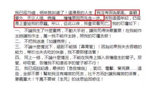 “不论我生了什么重病,不动大手术,让我死得快最重要!在我能作主时让我作主,万一我不能作主时,照我的叮嘱去做!不把我送进‘加护病房’。不论什么情况下,绝对不能插‘鼻胃管’!因为如果我失去吞咽的能力,等于也失去吃的快乐,我不要那样活着!”