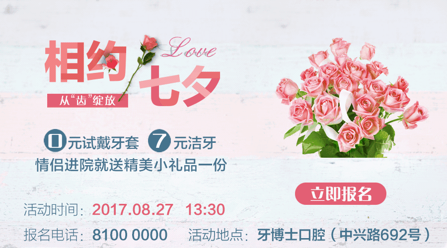 在七夕节即将来临之际,本栏目将携手宁波牙博士口腔医院在8月27日下午1:30共同策划一场浪漫七夕主题活动,凡活动到院的情侣均可均参加“爱的承诺”活动,写下爱的誓言,并获得由宁波牙博士口腔医院提供的浪漫玫瑰花,享受牙齿冷光美白二人同行,一人免单活动,并有专家一对一免费咨询,免费量身定制牙齿模型,免费试带隐形牙套。