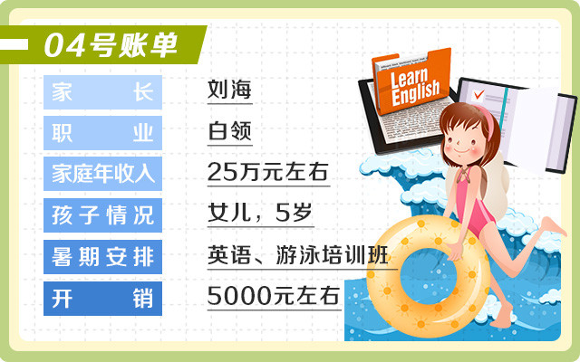 刘海的女儿今年才五岁,他就已经有计划地在给女儿报英语培训班。他认为语言要从娃娃抓起,越小开始学英语对孩子越有帮助。英语培训班一学年是费用是一万五左右,这个暑假除了上英语培训班之外,还上了游泳培训班,费用大概是一千多元。