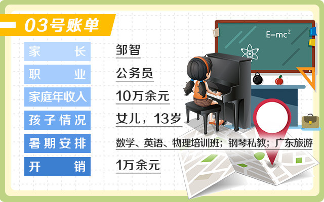 相比前两位家长,邹智暑期在孩子身上的开销要高很多。她和丈夫今年暑假花费了近万元给女儿报班学习。