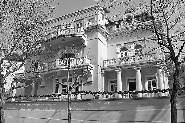 顶,檐下饰有精细的古典檐齿。沿武康路立面及两侧的屋檐口处设有巴洛克式的屋顶窗,椭圆形的窗洞下托着卷草纹饰,顶部还有石材凿出的弧面形贝壳造型,东西两侧屋面另还设有六个棚式老虎窗。建筑前后立面的各个楼面都有弧形的外阳台,围以宝瓶式栏杆,阳台下的支托亦作曲面造型。外墙以明显的两道腰线分作古典三段式的构图,底层可视为基座,以粗凿石块饰面,面向花园一侧建有巴洛克式的双向室外楼梯;二层以上原来是做的水泥斩假石墙面,经修缮后已被抹平;朝向武康路一侧还有塔司干式的柱廊楼梯通往二层,柱间栏杆作缠绕的绶带式样和椭圆形的透空。总之,在古典的框架上极尽装饰之能事便是巴洛克建筑的最重要特征。