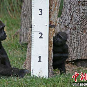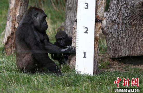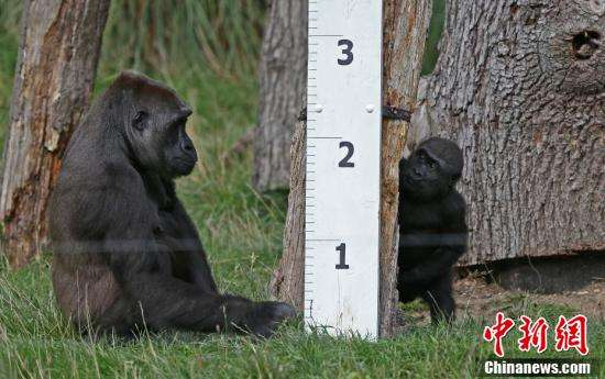 当地时间8月24日,英国伦敦动物园年度体检开始,小黑猩猩“偷瞄”自己身高。