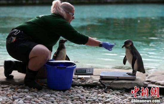 园内的工作人员用美食诱惑企鹅走上电子秤。