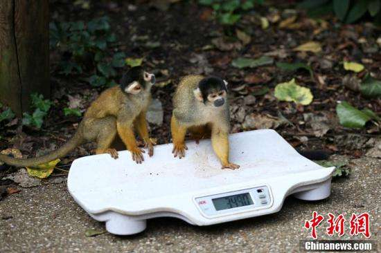 两只松鼠猴很“自觉”的一起走上电子秤。
