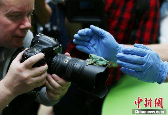 一只树蛙在测体重的时候从不老实地直接跳到摄影师的镜头上。