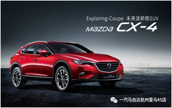 作为马自达首款第6.5代产品,CX-4代表了马自达品牌精髓和最新造车理念,精准的把握了当今年轻消费群体的个性需求。在外观上,它展现出新时代SUV设计的先进性,采用具有浓郁轿跑风格的黄金运动比例车身,打造出引领未来的存在感设计。它的出现,改变了传统SUV高大笨重的操控体验,马自达充分发挥自身在运动化调校方面的造诣,使CX-4具有媲美轿跑车型的驾控感受,实现了车随意动的全能驾控。在科技配置方面,CX-4也能够代表未来发展趋势。利用人机工程设计,将ADD平视显示系统、马自达悦联系统等丰富的科技装备进行了科学的排列,使操作更加人性化,体现出智能人性的卓越功能。而在操控上,拥有“创驰蓝天”精髓的CX-4既有堪比轿车的轿车性能,又有SUV的高通过性,却又不会如传统SUV一般笨重,在行、转、停的不同驾驶状况下,都能实现驾驶者操控输入和车辆动作输出的一致,为驾驶者带来人马一体的驾驶乐趣。
